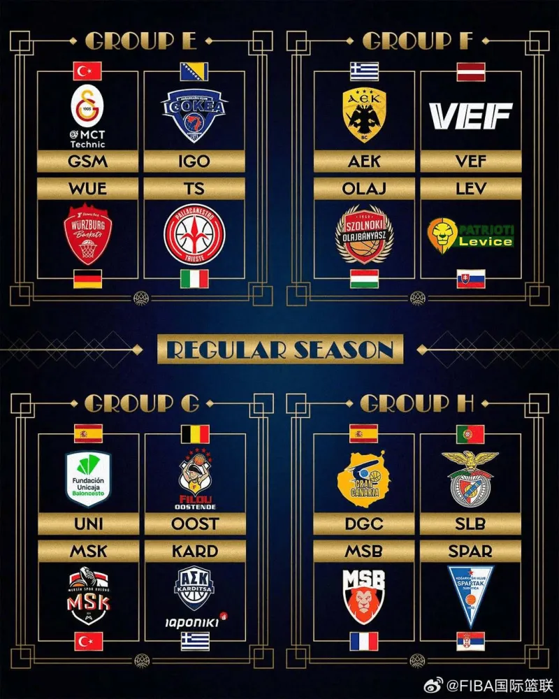 NBA赛程,NBA直播,NBA比分,NBA投注分析,詹姆斯,湖人,勇士/全面覆盖NBA职业篮球联赛,包括最新赛程、球队排名、实时比分、球星动态及投注数据分析,专为中文网民打造的NBA综合信息平台。虎扑09月30日讯 FIBA官方更新社媒,公布新赛季篮球冠军联赛参赛队伍。