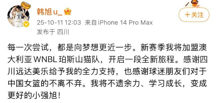 韩旭本人也在个人社交媒体上表达了喜悦与决心:“每一次尝试,都是向梦想更近一步。新赛季我将加盟澳大利亚WNBL珀斯山猫队,开启一段全新旅程。”她深情感谢了四川远达美乐俱乐部给予的支持,以及球迷们一如既往的关注和鼓励,“我将不遗余力、学习成长,变成更好的小强旭!”从中,我们能清晰地感受到韩旭对自我提升的执着追求,以及她希望通过不断进步来为中国女篮贡献力量的拳拳之心。