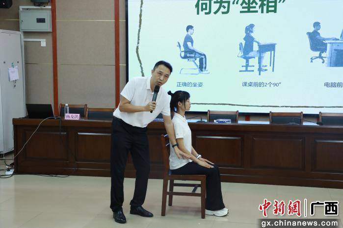 本次讲座由柳州职业技术大学副教授、国家级社会体育指导员杨友洪主讲。他详细介绍了国家体育总局发布的《儿童青少年身体姿态测试指标与方法》,针对目前青少年普遍存在的不良体态进行剖析,现场演示了颈部前伸、高低肩、胸椎后凸、骨盆异常、双侧腿不平衡、人体重心偏移、脊柱侧弯的检查方法,提出了“科学测评明体态,运动处方促健康”解决方案,如游泳、瑜伽部分体式改善脊柱侧弯,拉伸运动平衡高低肩肌肉,靠墙站立训练缓解驼背问题。