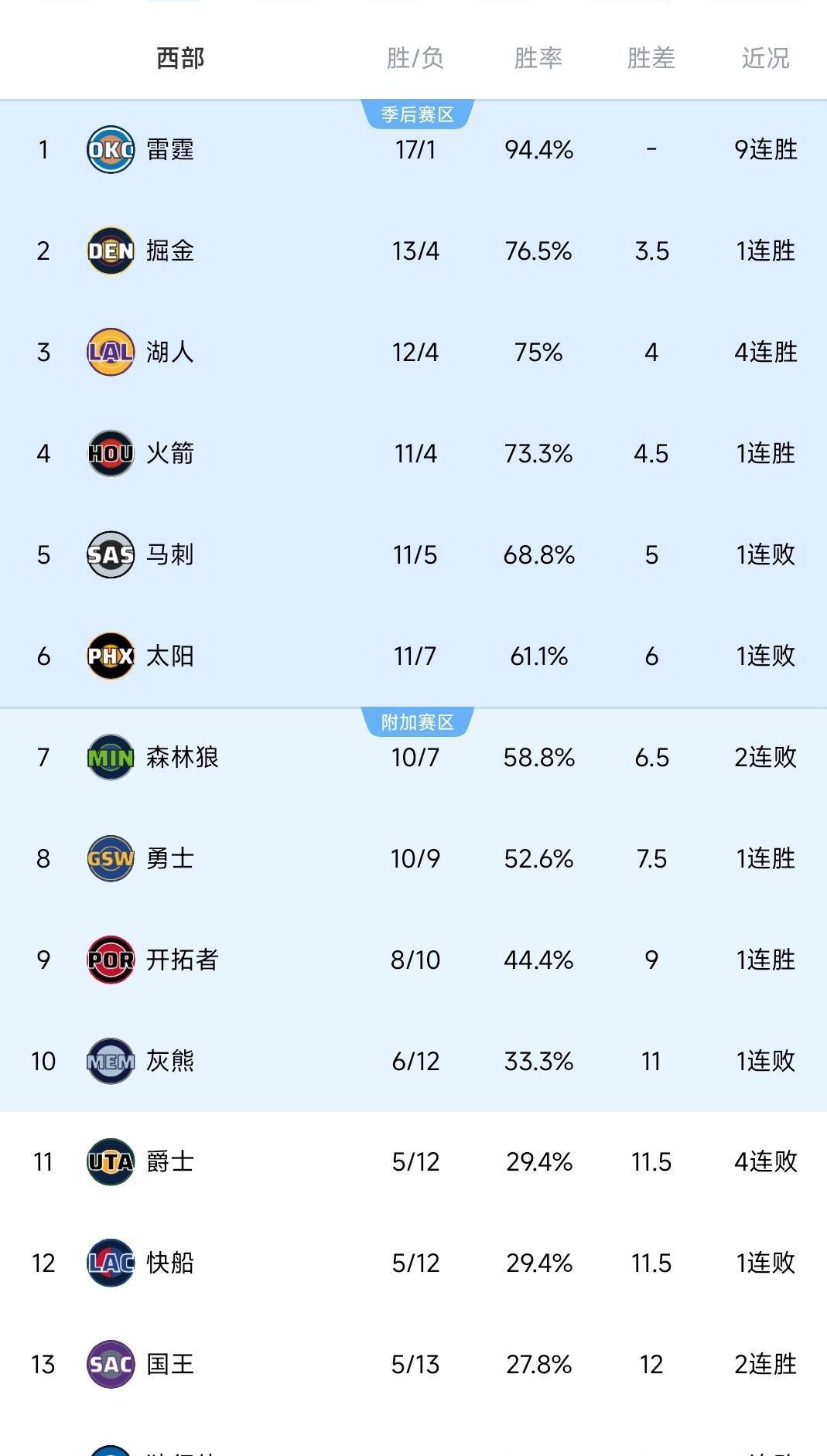 与此同时,西部排名也发生了显著变化。 卫冕冠军雷霆以17胜1负的联盟最佳战绩稳坐西部头把交椅,胜率高达94.4%。 雷霆保持了上赛季的冠军核心阵容,球员间的化学反应日益成熟。 掘金在战胜灰熊后以13胜4负反超湖人,重回西部第二位置。 湖人则以12胜4负暂列第三。 火箭队以11胜4负的战绩稳居第四,马刺11胜5负排名第五。 太阳、森林狼和勇士则在中游区域激烈竞争,勇士目前以10胜9负排名西部第八。
