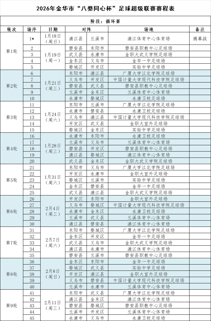 1月18日下午,揭幕战将在浦江县体育中心体育场举行,首战为浦江队对阵兰溪队。