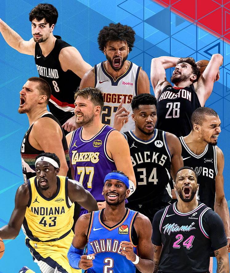 球员:卢卡·东契奇(洛杉矶湖人,斯洛文尼亚)、尼古拉·约基奇(丹佛掘金,塞尔维亚)、维克托·文班亚马(圣安东尼奥马刺,法国)、诺曼·鲍威尔(迈阿密热火,牙买加/美国)、丹尼·阿夫迪亚(波特兰开拓者,以色列)、阿尔佩伦-申京(休斯顿火箭,土耳其)、贾马尔·穆雷(丹佛掘金,加拿大)、帕斯卡尔·西亚卡姆(印第安纳步行者,喀麦隆)、卡尔-安东尼·唐斯(纽约尼克斯,多米尼加)
