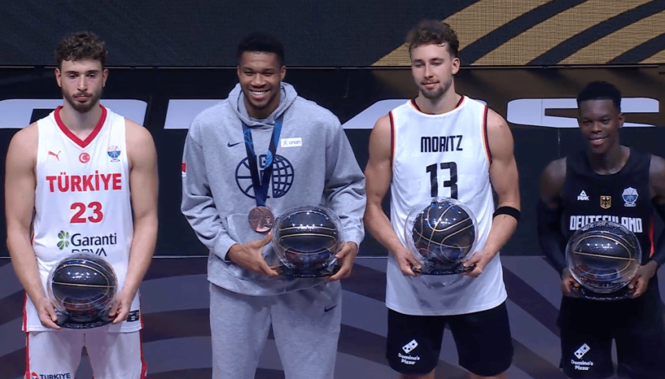 最后评最佳阵容的时候,字母哥和申京都入选了一阵,成了“队友”。但是,在领奖台上,这俩人全程零交流,一点互动都没有。字母哥倒是挺热情,跟德国队的施罗德又是拥抱又是聊天的。、