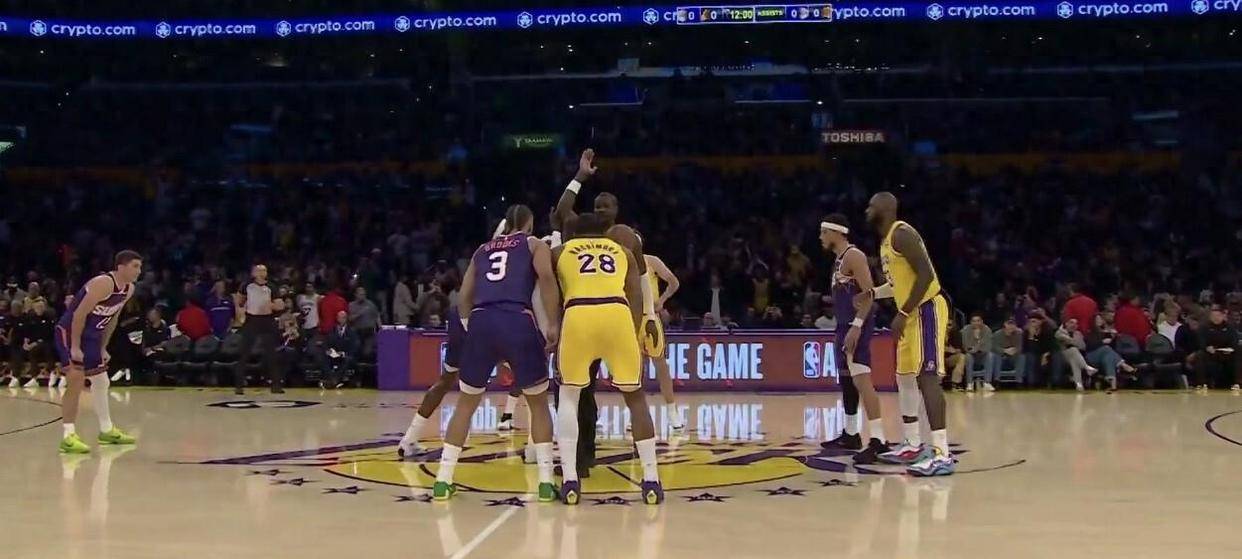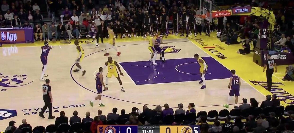 此役,湖人排出了以东契奇、里夫斯、艾顿、八村垒和詹姆斯组成的首发阵容。詹姆斯的复出取代了上一场首发的文森特,而斯马特则因下背部伤病继续缺席。太阳方面,他们的首发五虎将是布克、狄龙、奥尼尔、威廉姆斯和吉莱斯皮,他们用吉莱斯皮和威廉姆斯顶替了阿伦和伊戈达罗的位置。太阳目前饱受伤病困扰,杰伦·格林等球员均无法出战,布克不得不独自扛起球队前进,近十场比赛他的场均出场时间高达38.5分钟,体能隐患不容忽视。