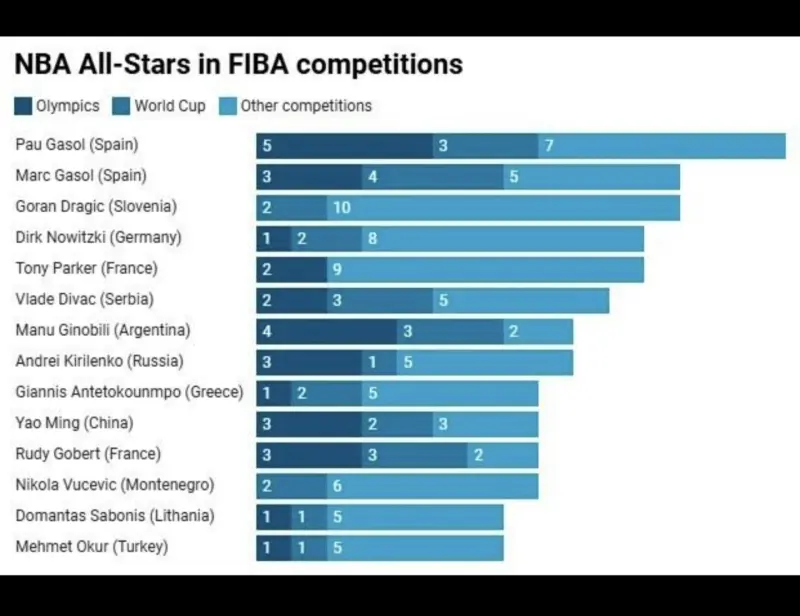 NBA赛程,NBA直播,NBA比分,NBA投注分析,詹姆斯,湖人,勇士/全面覆盖NBA职业篮球联赛,包括最新赛程、球队排名、实时比分、球星动态及投注数据分析,专为中文网民打造的NBA综合信息平台。直播吧讯,2025男篮欧锦赛正在进行中,美媒HoopsHype统计了为国家队出战大赛次数最多的一些NBA球星,保罗-加索尔15次居首,姚明8次并列第9。